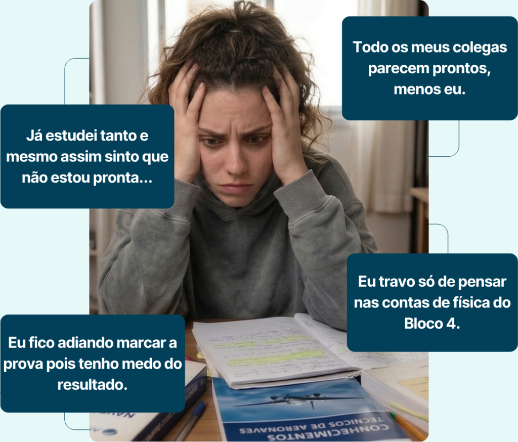 Pare de se surpreender no dia da prova. Treine com o mesmo tempo e a mesma pressão do exame oficial da ANAC para ganhar o fôlego necessário. Você entra na sala sabendo exatamente como gerenciar seus minutos e sua ansiedade.